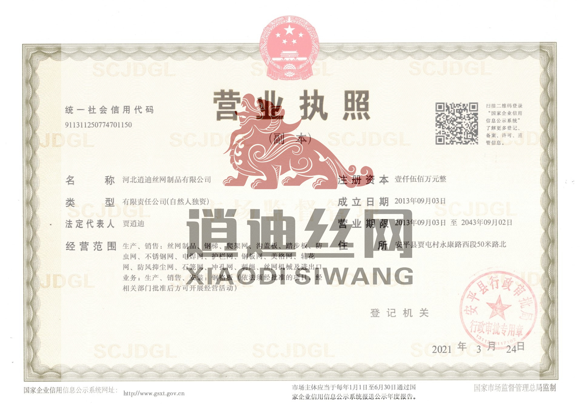 河北逍迪絲網(wǎng)制品有限公司誠信天下,誠信是我們公司一個原則問題不可撼動的,以心中有誠信的思想結(jié)交五湖四海的朋友,能達到雙贏是最好的,我們堅信朋友多了路好走,我們公司都是老朋友多,我們一直是這樣做的。河北逍迪絲網(wǎng)制品有限公司成立于2013年注冊資本壹仟伍佰萬整,主要生產(chǎn)沖孔網(wǎng),鋼格板,金屬防蟲網(wǎng),如實的實體廠家,是一家-研發(fā)-銷售-生產(chǎn)-安裝-售后一條龍公司,2019年通過了ISO 9001認證管理體系符合GB/T 19001-2016/ISO 9001:2015標準,同時通過了SGS認證,擁有商標版權(quán)2品牌,擁有一個著作版權(quán),河北逍迪絲網(wǎng)制品有限公司位于中國有名的(絲網(wǎng)之鄉(xiāng))安平縣,于天津,北京,雄安,石家莊相鄰,交通非常發(fā)達,出口可以選擇天津港口非常近每天都有接貨送貨往返車輛,空運可以選擇石家莊正定機場,附近也有鐵路運輸,當?shù)剡€有兩個生態(tài)物流園區(qū)發(fā)往全國各地,我們沖孔網(wǎng)工廠生產(chǎn)設備有:普通沖壓機,高速沖壓機,自主研發(fā)小微孔沖壓機,龍門沖,磚塔沖孔,重型沖孔機,萬瓦級別激光切割機,3000W激光切割機,焊接設備,折彎機,校平機,剪板機,精密校平機,(對板面平整度要求苛刻的客戶群體0.5-0.2誤差)我們公司銷售市場沒有局限性國內(nèi)國外都供應,擁有出口權(quán)...